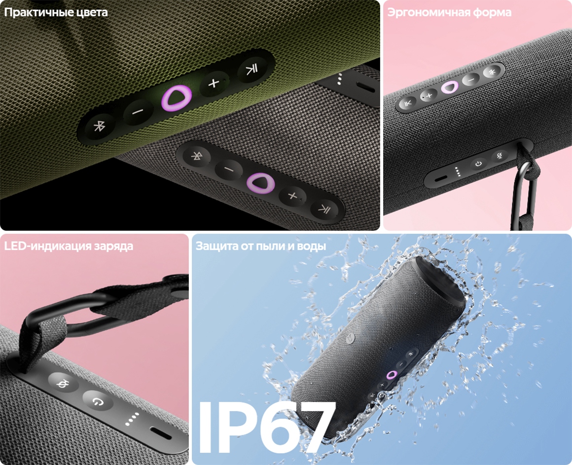 Благодаря высокому классу защиты IP67 Яндекс Станция Стрит устойчива к пыли и воде?, а ткань приглушённых цветов не выгорает на солнце. Если в зарядный разъём попадёт вода, Алиса сама напомнит просушить колонку.